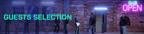 Stand in front of your club and decide who can get in and who can not. Your choices affect the club's reputation and the type of guests visiting your club. Show bodyguards that you don't want thieves and perverts at the club - unless you want to party with them ...