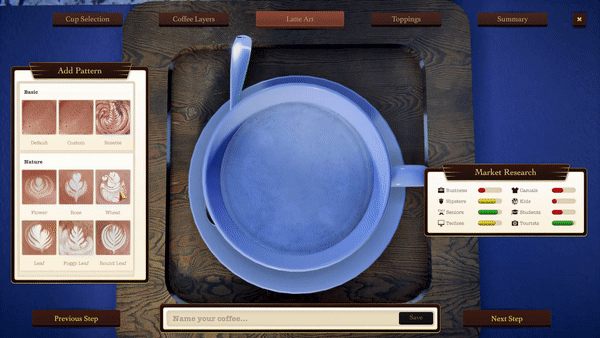 You have your favorite coffee, right? So do your customers. Do market research to find out their preferences. Use a 3D coffee editor to make different recipes to delight them. You can combine multiple ingredients in a very creative way. Use different layers, and toppings, and create beautiful latte art!