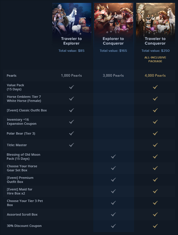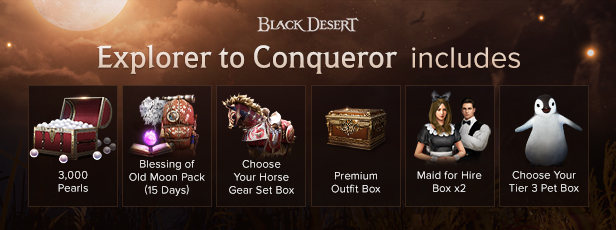 Blessing of Old Moon Pack (15 Days)- Contains a Value Pack, Blessing of Kamasylve, and a Secret Book of Old Moon. These items provide extremely useful benefits that will enhance your adventure!