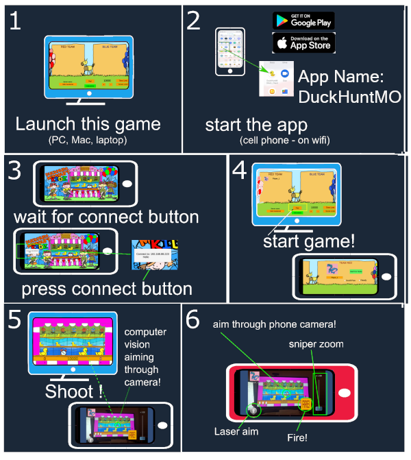 Mindblowing novel patented computer vision algorithm enables you to shoot directly on the screen (using your cellphones) and have ultimate fun with many of your friends divided into two teams - for target gallery duck shooting! (see instructions below)