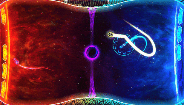 PLANETARY ARENAPlayers: 2-4A twist on the base rules of the game, thanks to a black hole! Two Teams (either 1v1 or 2v2) face each other, defending their planet in an arena where the whole side of the screen counts as their goal. In addition to that, the playing field is divided by black hole barrier. Shooting the ball through the black hole gives it more power and will make it fly extremely fast!