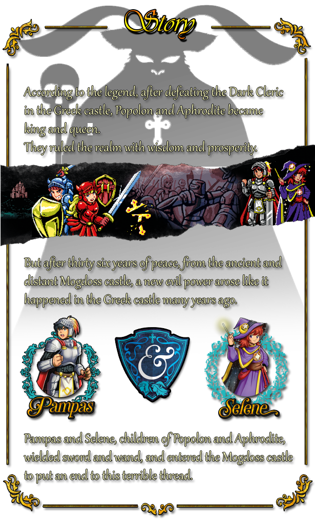 Pampas and Selene, children of Popolon and Aphrodite, wield both sword and wand as they enter Mogdoss Castle to put an end to this terrible threat.