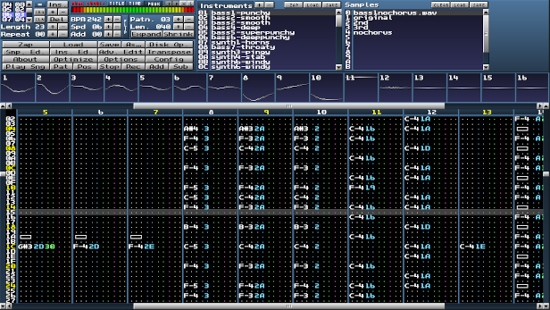 I created this soundtrack using samples I made on a Korg Volca FM synth (FM Synthesis is the same kind of synth used in the Sega Genesis/Megadrive), as well as samples from a 90's era Alesis QS6 and a Boss Dr. Rhythm DR-670. These samples are then loaded into a clone of a 90's era tracker, FastTracker 2, called MilkyTracker. This is what the tracker looks like: