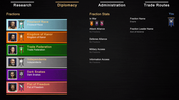 Dive into the complex diplomacy system and conduct negotiations with other factions, make agreements, alliances or prepare your alliance for war.