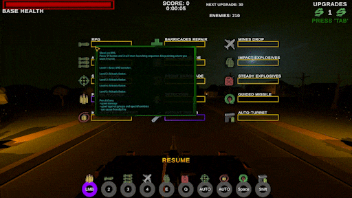 multiple weapons: there are many weapons at your disposal. From standard trusty machine gun, grenades, and Molotov cocktails to secret army technology self-teleporting auto-aiming gun turrets. Don't worry about ammunition limits and give them hell!