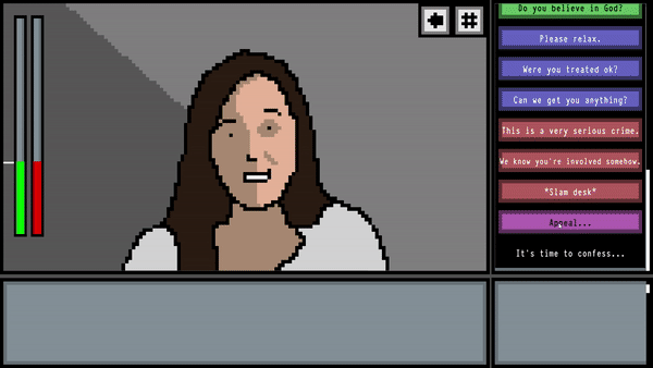 Inspired by JCS videos and similar Interrogation analysis. Match evidence with statements. Play good cop/bad cop. Make choices. Learn what makes people tick. Unravel the mystery.
