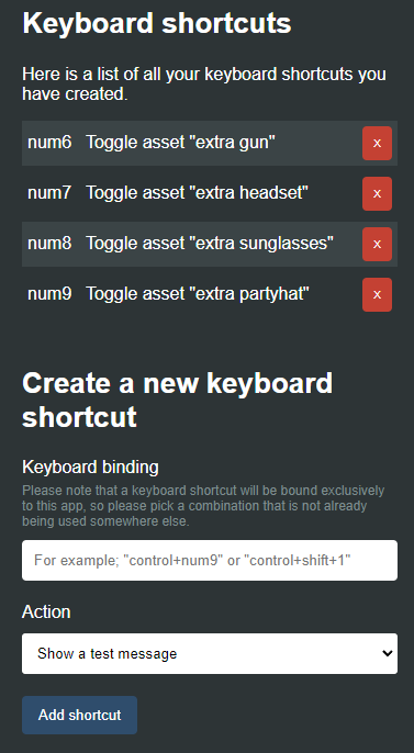 - Create global keyboard shortcuts to control your assets (shortcuts can also be triggered by Elgato Stream Deck as well)