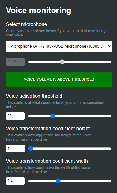 - Optional voice monitoring in order to transform assets according to voice volume levels (for example, show/hide assets or simulating a mouth talking when speaking into the microphone)