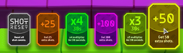 Spin the wheel in order to get cards that will help you throughout the game. Cards include a territory shield, extra shots, multipliers and more.