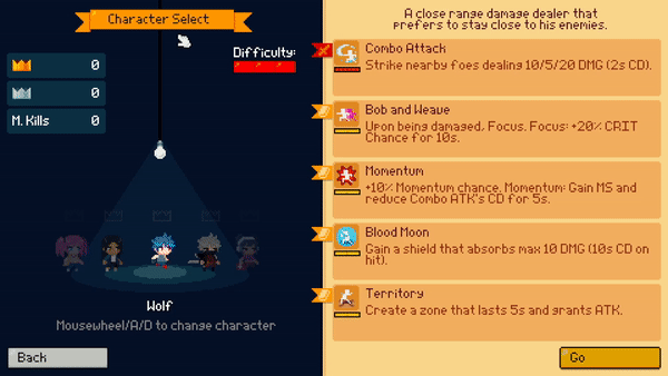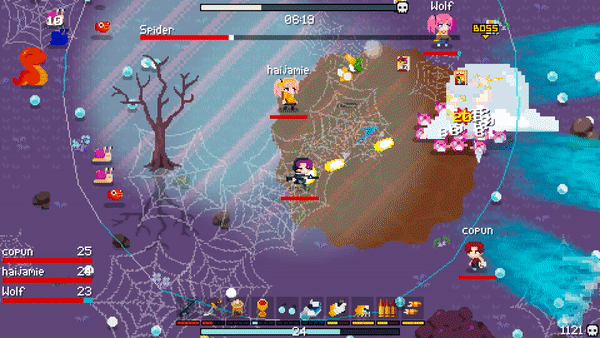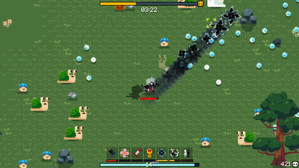 Fight, level up, buy, survive! Choose from multiple stages! Can you do it? Start off at level 1 with only your character's unique weapon. As you fight mobs, they will drop XP, which you can collect to level up. Leveling up opens up a shop where you can purchase new equips or upgrade your current ones in order to become stronger.