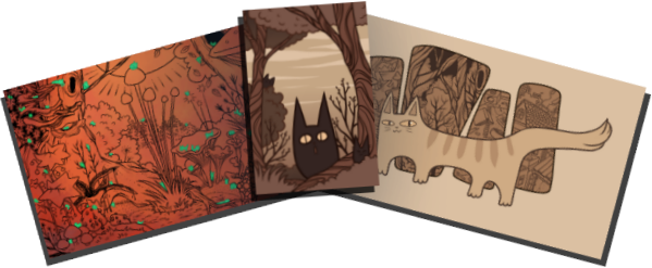 Wallpapers. These are the colored pages, with the cats shown! They double as a guide for cat locations too. Also includes the menu and cover art.
