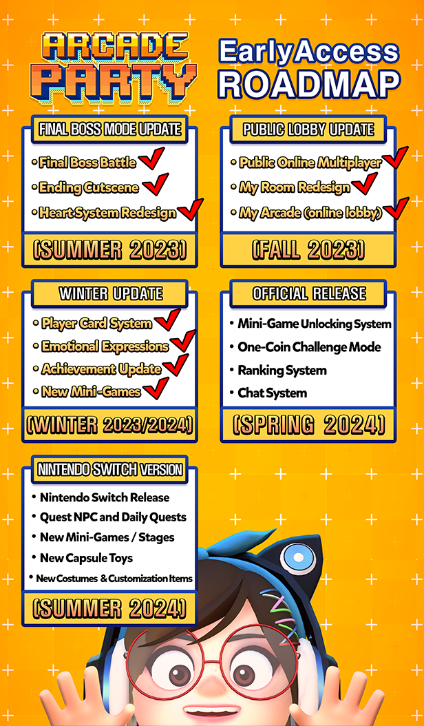 Arcade Party is an exciting co-op party game where 1-4 players can enjoy tons of arcade inspired mini-games together online or locally.