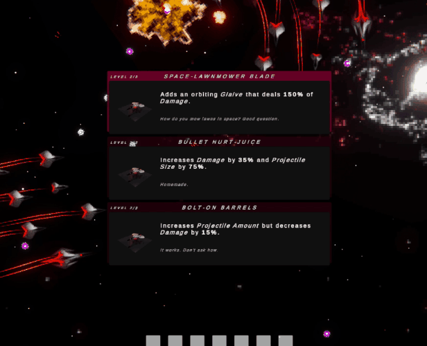 BuildcraftAs you destroy enemies, you choose weapons and modules from a pool of randomly selected upgrades - turning your ship from a rustbucket with wings into a cacophony of destruction. No run is ever the same as you are encouraged to experiment heavily with a myriad possible upgrade options and build paths,