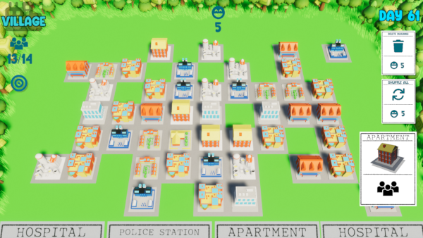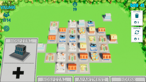 You will have at your disposal a series of randomly generated cards with different buildings to construct. Each building has an area range that you must place correctly to prevent your population from decreasing.