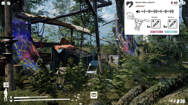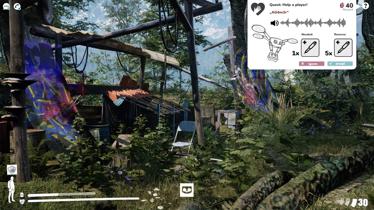 To bring more life in the different ways of player interaction we developed a dynamic quest system. Not only we as devs give quests to our players, you as a player can create these too. May it be a bounty on someones head or may it be a call for help when you ran into trouble. Even trading or raiding a compound as a team can be done that way.