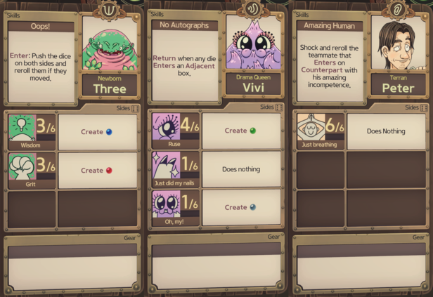 luck and odds. As you work your way through situations, you'll have the opportunity to "upgrade" your teammates by changing the composition of the dice sides, or enhancing their effects and abilities to produce more auras or be more