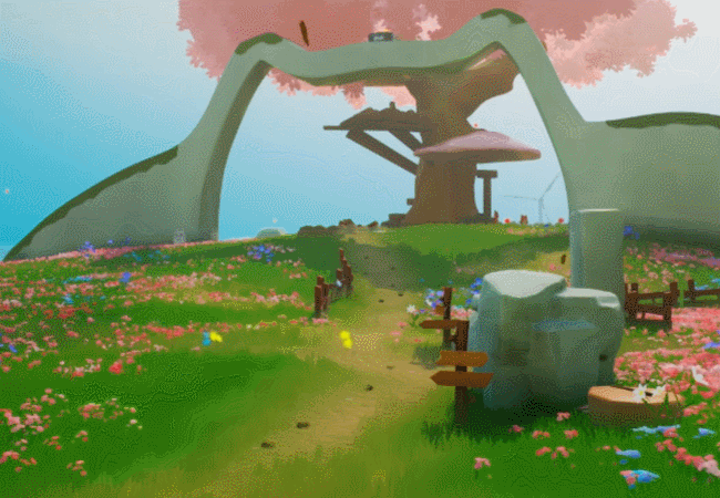 We start off in a coastal area, where our protagonist collects a shell or two along their way. Then they find a tram station that's caught up in a bit of trouble. Once everything's been put back in order, it's a short tram trip to the mountain path on the other side of the island!