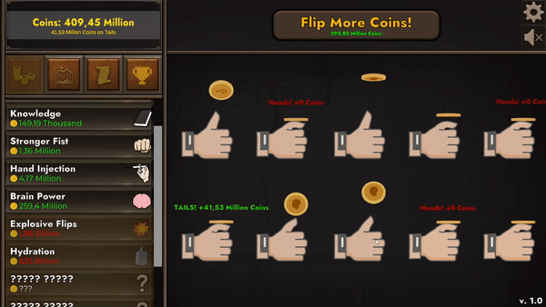 Coin Flipper is a game about flipping coins. You will start with a simple coin to flip that will give you 1 coin if it lands on your side of choosing. The more coins you flip the more coins you get to spend on upgrades which will give you more coins to flip which will give you even more coins to spend! You will choose either heads or tails which will determine if you get coins on the side of your choosing. But it's not always 50/50. You always have a small chance to hit a lucky coin which gives you extra coins!
