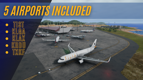 - 6 airports included in the base game (TIST; KLGA; KLAX; KRDU; TXKF; EDDS)