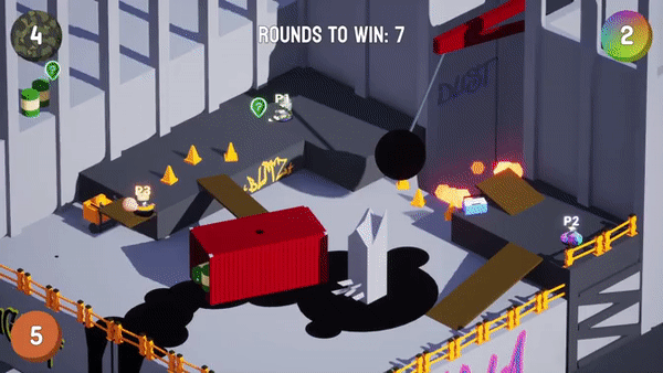 maximum battle-capability -- in other words, we strapped knives, forks, and whatever other dangerously pointy household items we could find to the top of them. The objective of the game is simple: use your chosen weapon to pop your opponent's dust balloon (located on their hind-quarters) before they can pop yours! Our Broombots also have a variety of maneuverability options at their disposal! Players will need to jump, dash and drift across 14 themed maps and 3 intense gamemodes in order to prove themselves as the ultimate cleaning machine.