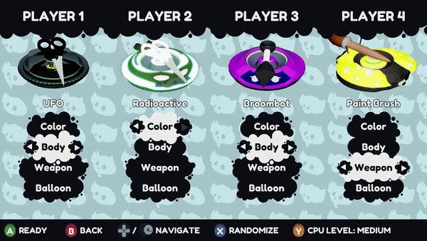 Only one Broombot can be crowned the victor! Destroy or outlast your opponents by any means necessary. The player who wins a set amount of matches will take the crown. Set levels to cycle between rounds for added craziness!
