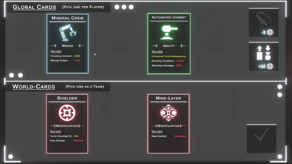 Player Upgrades! Choose Cards to improve you Ship as you like. More Mining-Range? More Attack-Speed? You want a Turret following you? No Problem!