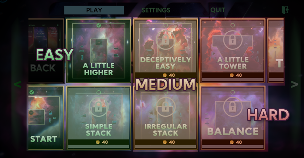 Every category contains a selection of levels, from easy to hard, to allow everyone to explore the whole game.