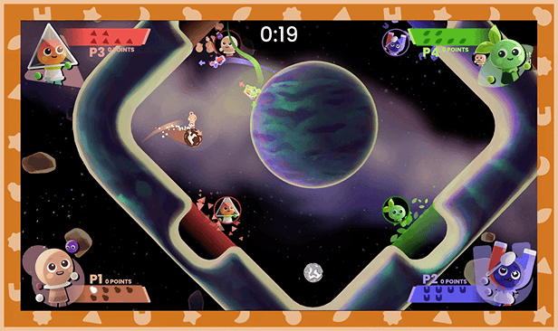 Each event features its own unique bite-sized challenge where up to 4 players can compete. Eject your friends into space as you race across gravity fields, score a goal with an entire moon, leap across planets to escape a black hole, and capture and hold zodiacal constellations.