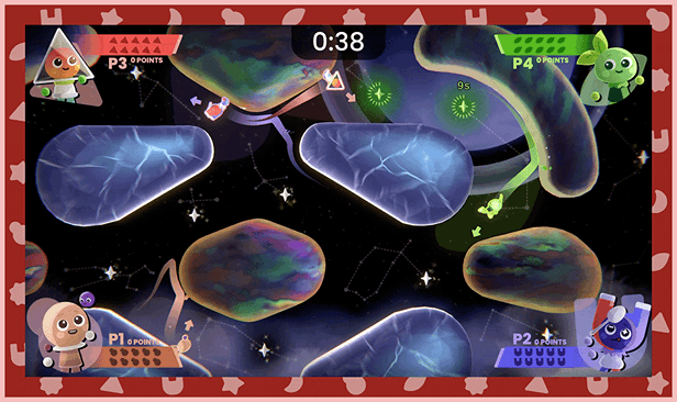 The Star Ring is the place to be: jostle with friends to remain in its roving and life-giving light, the only place that fills your scorebar. The first player to fill up their scorebar wins!