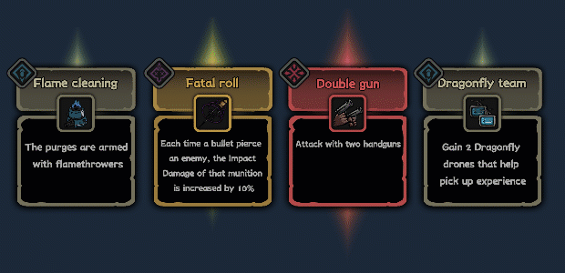 During the game, most monsters will drop experience when they die. Players can collect experience when they get close to it. After collecting enough experience, players can choose one of many enhancements to enhance themselves. We don’t want to make that kind of upgrade interface only "attack Power +1/shooting speed -2" and other options, so a lot of non-numerical enhancements have been made. Non-numerical means that in addition to simple attack power values, you also need to pay attention to whether the mechanism of the combination of enhancements you choose is powerful. At the beginning of the game, you can only choose the enhancement that you may not be satisfied with from the extremely limited enhancement options, but as you pass more tasks, you will soon be able to get some blessings to make the process more comfortable, You may be able to see more options, or the overall quality of the choices offered to you is better, or you can choose again. to complete more tasks.