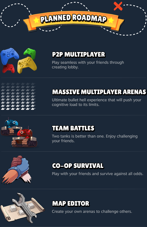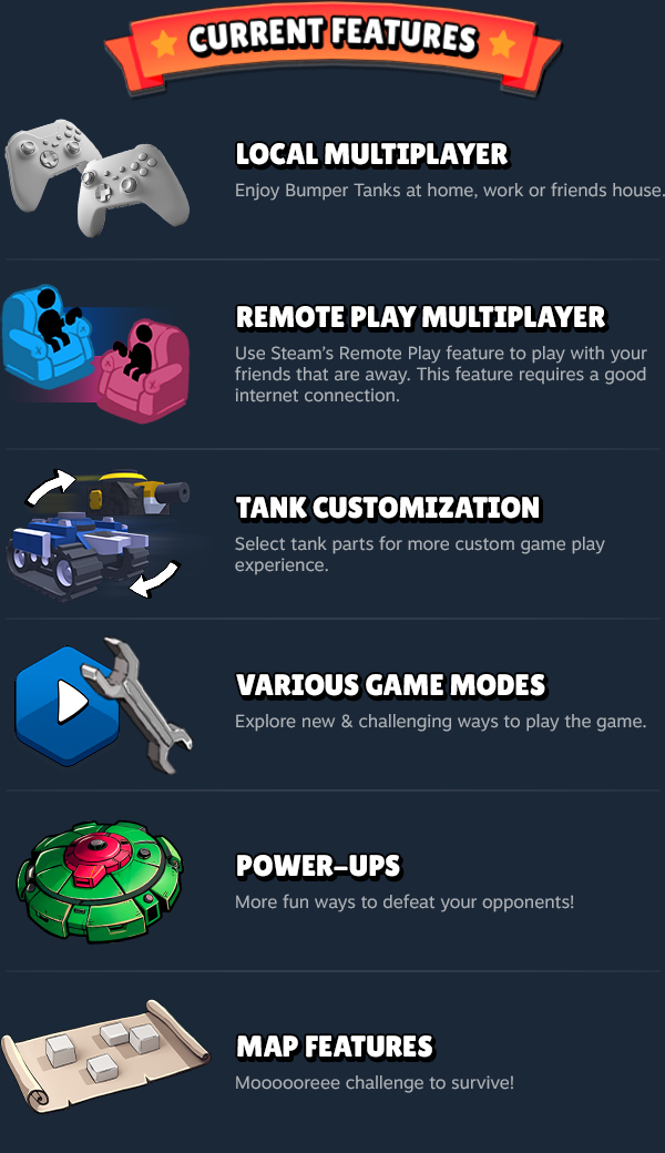 Take control of a tank and dash into the fight in this couch multiplayer, fast-paced, twin-stick shooter game! Collect various power-ups to hook around the destructible environment and blast your friends with whatever it takes. Remember: One shot, One kill!