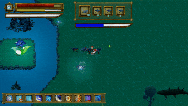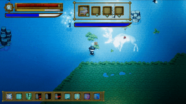 A pixel Open World Craft Survival RPG. Its characteristics are challenging fights, cooking, and free character development. And its a crude and slow-paced game.