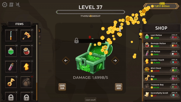 Prestige & Skill TreeOnce you have enough skill points, you can choose to prestige. Spend your skill points on unique prestige upgrades tailored to your play style. There are upgrades available to suit every preference. Invest all your skill points into passive damage and witness the chests opening effortlessly while you relax. If you prefer the spectacle of gold and treasures flying out from the chests, allocate your skill points towards the gold and treasure upgrades. Regardless of how you choose to allocate your skill points, you will significantly enhance your strength!