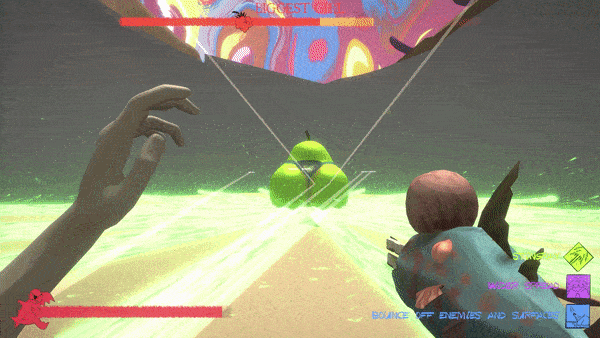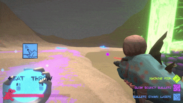 FISHGUN is a chaotic fish-person shooter. The evil fruit have taken over and drained the ocean. Use your fish gun to defeat the fruit and confront their queen.