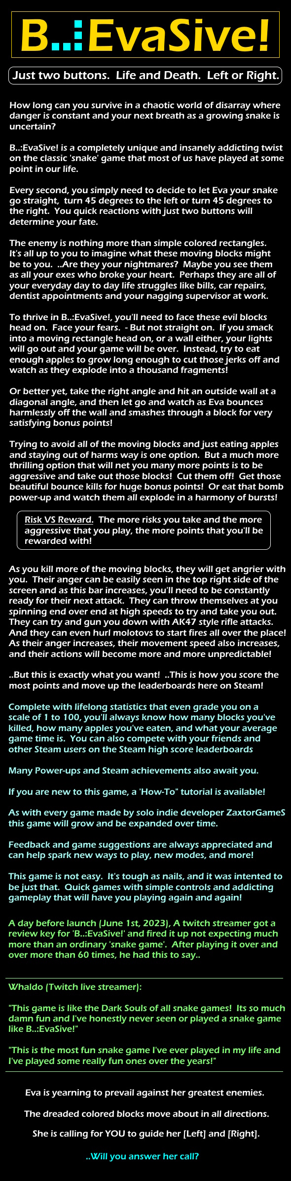 Welcome to a world of dangerous rectangles where quick reflexes and maneuvering will help you keep breathing... Well, for at least a few more seconds! Two buttons. Life or death. How long can you survive? Okay, so you died. Try Again. Die. One more time. Die. Just one more. Die. One more!