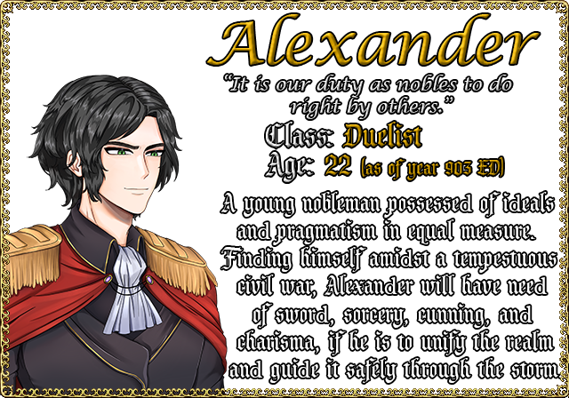 To some, the obligations of a lord are but a burden; to others, a farce. Yet to one like Alexander, who is possessed of the conviction to embrace his obligations, naught could bring greater satisfaction that using his power for good. Beneath the banner of such a lord gather allies, both those drawn by the flame of his will and those who have been touched by the light of his actions. Along the narrow path to victory, Alexander will gather a group of loyal companions—lovers, friends, rivals, allies, even those who were once his enemies, each with unique personalities and skills. Together with them, he will delve into the dark places of the world, traverse mountains, fight great battles... and perhaps most of all, struggle against those most terrible of shadows—those that lurk in the hearts of men, wrought by greed, hatred, envy, and sometimes lust.