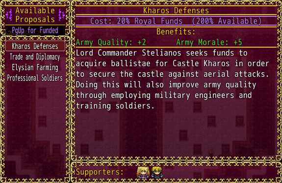 Beyond the battlefield, a lord must rule his realm. To see this done, Alexander must carefully build and manage key factors like Popular Support, Noble Support, Economic Status, Army Size, and Army Quality, factors that will have important impacts as the game proceeds. Hold court and rule upon upon the disputes that divide the realm, and determine where best to spend your Royal Funds for the good of the realm!
