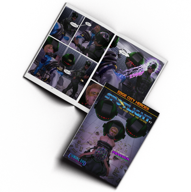 But Spotlight’s night isn’t done. While monsters attack the city, a bank robbery is in progress, and there aren’t any heroes left to stop it. Spotlight stumbles upon a new super villain ready to take on Edge City: Psycock and his Techno Balls.