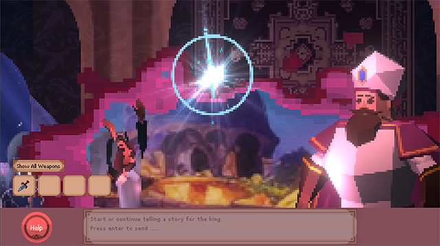 From Language to Reality! - As the heroine Shahrzad, you have the magic that turns other one's language into reality! Guide the King (powered by GPT-4) to weave tales abundant in keywords, such as 'sword', 'knife', or 'shield' ... they materialize as in-game weapons!