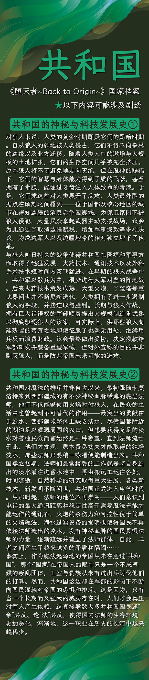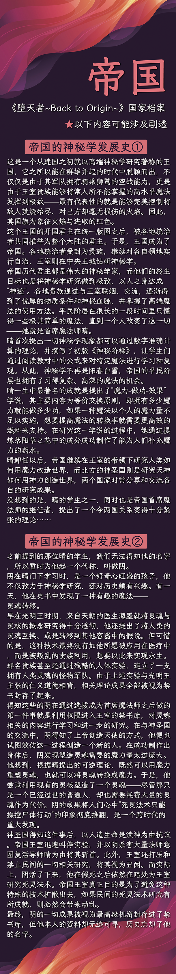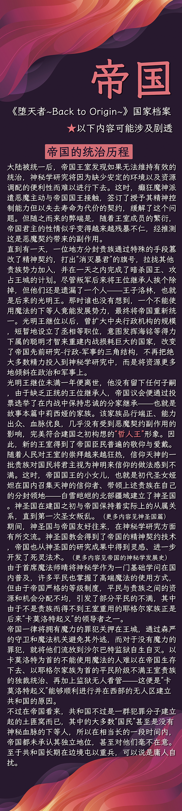 这是一个仅包含《堕天者~Back to Origin~》中帝国、共和国、神圣国文字档案的扩展包(下载→右键库里的游戏→管理→浏览本地文件→打开DLC文件夹即可查看,档案有图片/文字两种形式,内容一致,也可以在下面的商店简介中直接查看图片版本),欢迎对游戏世界观有兴趣的玩家免费下载阅读,揭开更多属于这个世界、这些国家的历史机密。