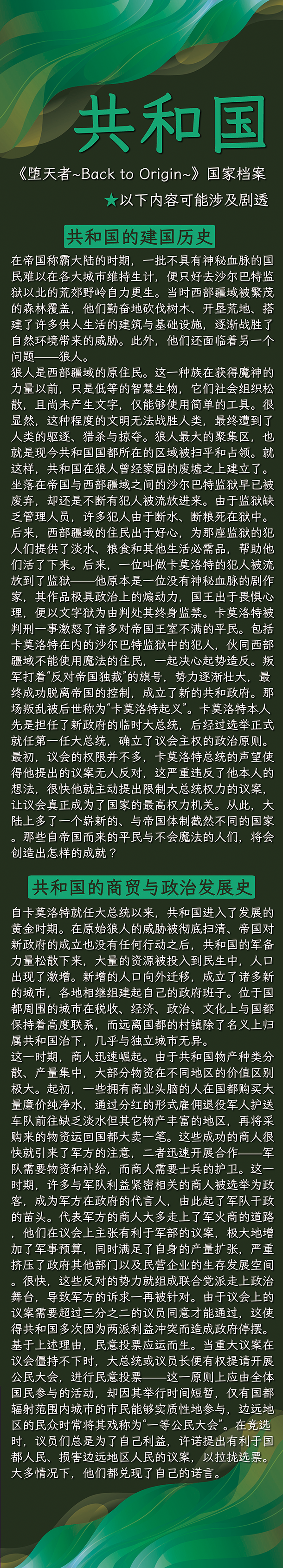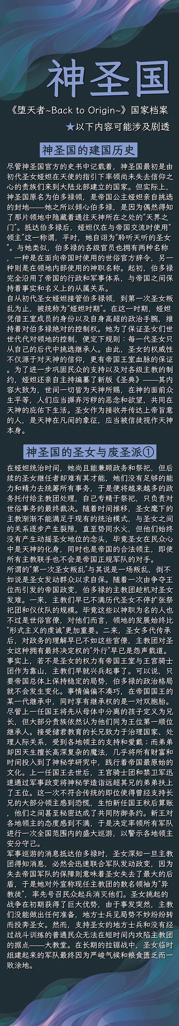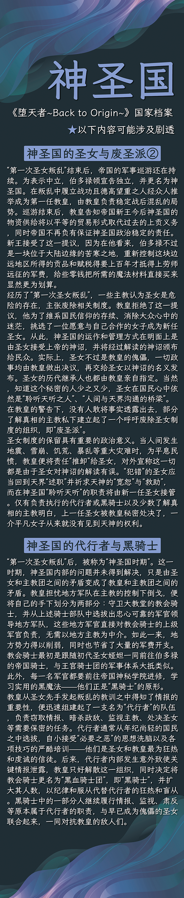 这是一个仅包含《堕天者~Back to Origin~》中帝国、共和国、神圣国文字档案的扩展包(下载→右键库里的游戏→管理→浏览本地文件→打开DLC文件夹即可查看,档案有图片/文字两种形式,内容一致,也可以在下面的商店简介中直接查看图片版本),欢迎对游戏世界观有兴趣的玩家免费下载阅读,揭开更多属于这个世界、这些国家的历史机密。