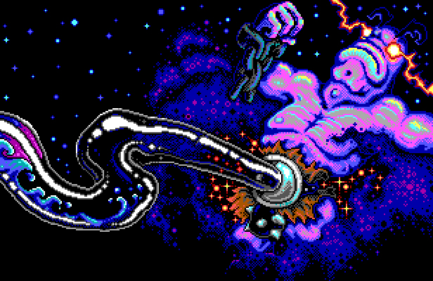 Monochromulus has broken free of the CGA nebula and extended his Proboscis-Umbilicus toward the peaceful planet of EGA… With a suction, only pure evil can muster, Monochromulus sucks up the color orbs and delicious meats of EGA. For he loathes the vibrant colors of the cosmos and intends to mix them all together and cover the universe in brown techno gravy. Only you can save the universe from a monochromatic gravy drenched future!