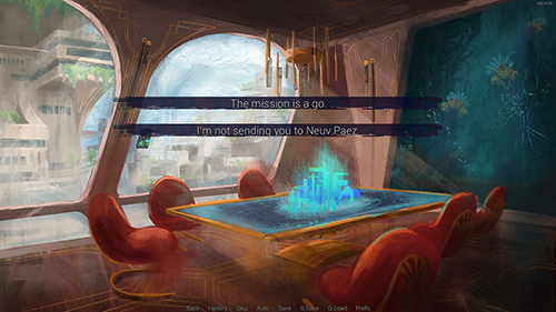 We gave a lot of thought to the best way to connect theme and style in this project, and how to use the specific inherent narrative devices of Visual Novels to their fullest extent… and it quickly became self-evident that Sym.BIOS: Torn Asunder had to be a story about choices. From Oli’s chronic indecisiveness to the overwhelming responsibility on Galanos’ shoulders every time he makes a decision for the team, this theme runs all through the story until its end, when every little choices will have potentially dramatic consequences on the game’s outcome.