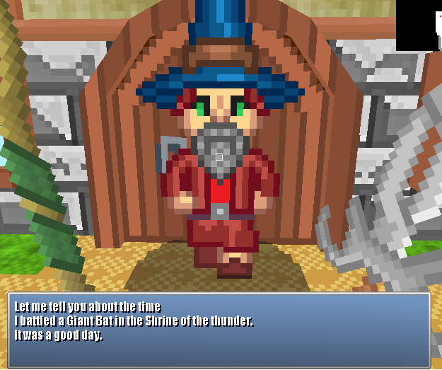 This is Abraham, he retired and opened a Weapon Shop. His dialogue is taken from his adventures when he was being used as a character, for instance the Giant bat he speaks about was the boss he fought in that dungeon. Each NPC is unique to each persons game.