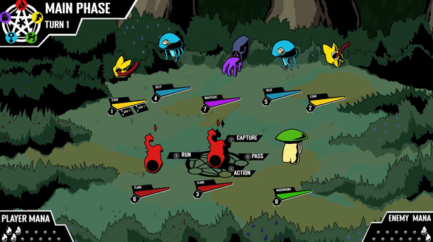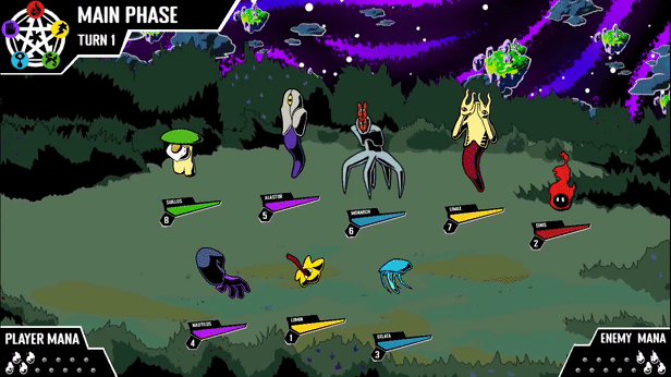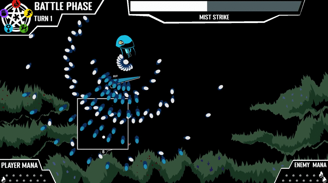 MANA SYSTEM Spend mana each turn for spirits to perform moves MAIN PHASE: Use buffs & debuffs & to control the battlefield BATTLE PHASE: Choose attacks to deal damage & dodge bullet hell projectiles.
