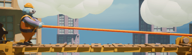 Both buddies are responsible for different tasks on the job. Rotating the crane, picking up building blocks and honking away aggressive sheep have to be coordinated to finish the job on time and with minimal collateral damage.