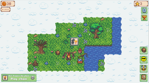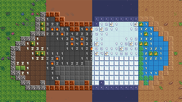 Following the storyline, you will have to perform different actions. For example: disperse clouds, make a bonfire, catch fish, craft a backpack. For all this there are thematic skins of minefields, which make the world of the game even more diverse.