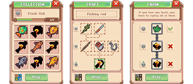 Craft - each horizontal stage with levels has its own difficulty. The order of completing the levels can be chosen by advancing through the scheme.