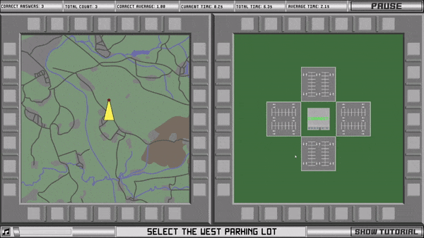 This test measures and improves your ability to determine your aircraft's heading with nothing but your directional orientation shown on a map. In the test, a map is shown with your aircraft's heading depicted as an arrow. On the right side of the screen is a display showing a top-down visual of buildings from your perspective in the aircraft. Simply select the correct building when prompted based on the directional orientation shown on the map.