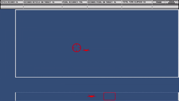 - [TBAS and PBMB] RETICLE TRACKING TEST (Flight Stick Recommended): An aircraft silhouette travels horizontally and vertically around the screen. A flight stick, "WASD" keyboard keys, or gamepad control stick are used to move the reticle on the screen over the aircraft silhouette. The goal is to raise your "Reticle Accuracy", which increases when the reticle is over the aircraft silhouette.
